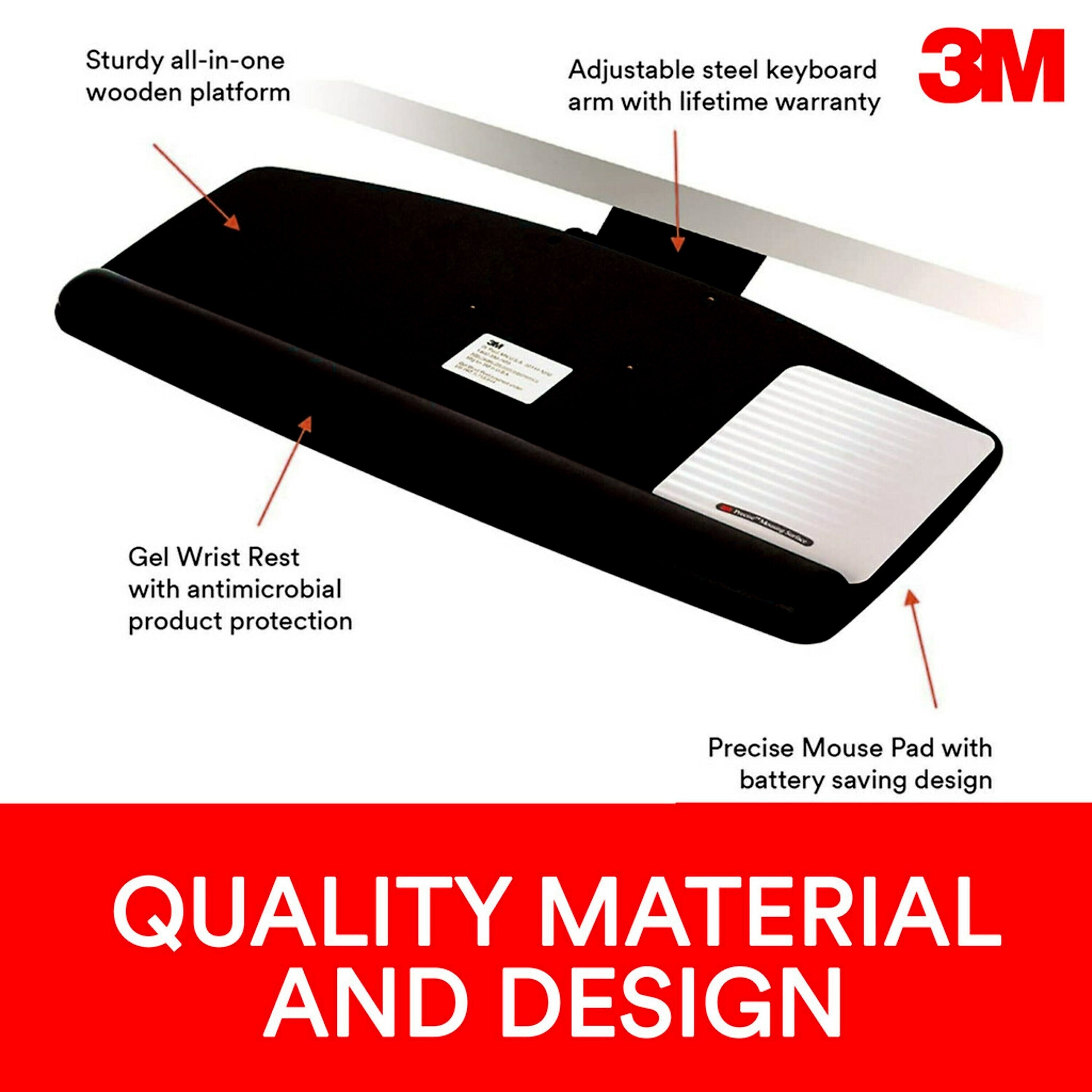 3M™ Easy adjust keyboard tray with standard platform in black color is made of leatherette wrist rest cover for durability. Tray has gel wrist rest with antimicrobial product protection.