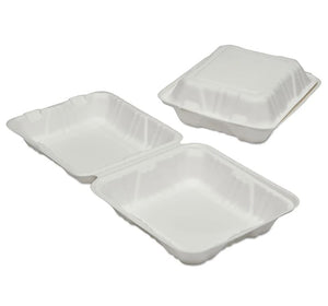 Bio-based food containers with hinged lids and secure closures are ideal for transporting and storing hot or cold foods. Square microwavable containers have high insulation qualities yet resist grease. Tabs on hinged lid and slots in base allow secure closure. TAA-compliant food containers are made of wood pulp.