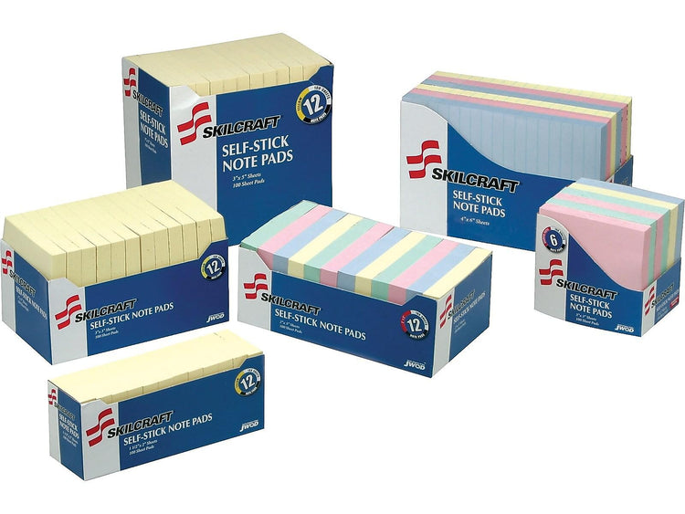 Write reminders and short to-do lists on these self-stick note pads. The strip of adhesive at the back of each sheet enables sticking on any surface and clean and simple removal. These Skilcraft yellow self-stick note pads are repositionable and ideal for sticking reminders on your desk and as a bookmark.