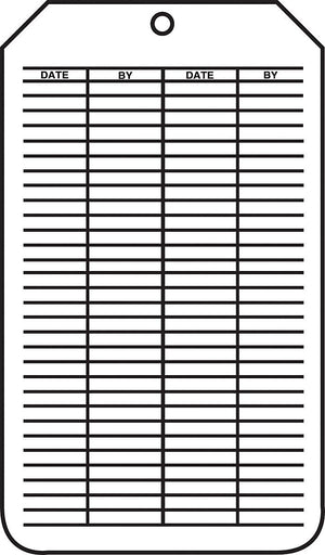 Accuform Signs® "EMERGENCY.." Cardstock equipment status tag has 4 columns with the headers that read date, by, date and by on both sides. 5 3/4" x 3 1/4" Tag features flexible 10 mil plastic surface and is water resistant, sold as 25 per pack.