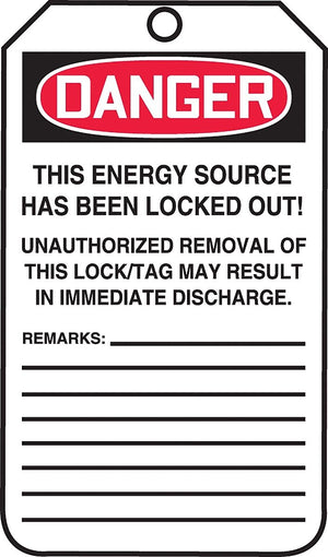 Accuform Signs® "DANGER..LOCKED OUT" PF-Cardstock lockout tag uses warning text to prevent machine operation/power activation. Tag measuring 5 3/4" x 3 1/4" includes 3/8" dia hole for quick and easy fastening, sold as 25 per pack.
