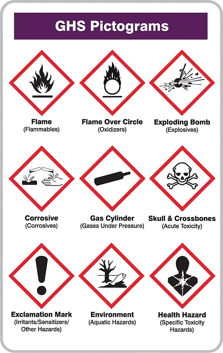 - Side one shows a representation of the 9 standard GHS pictograms