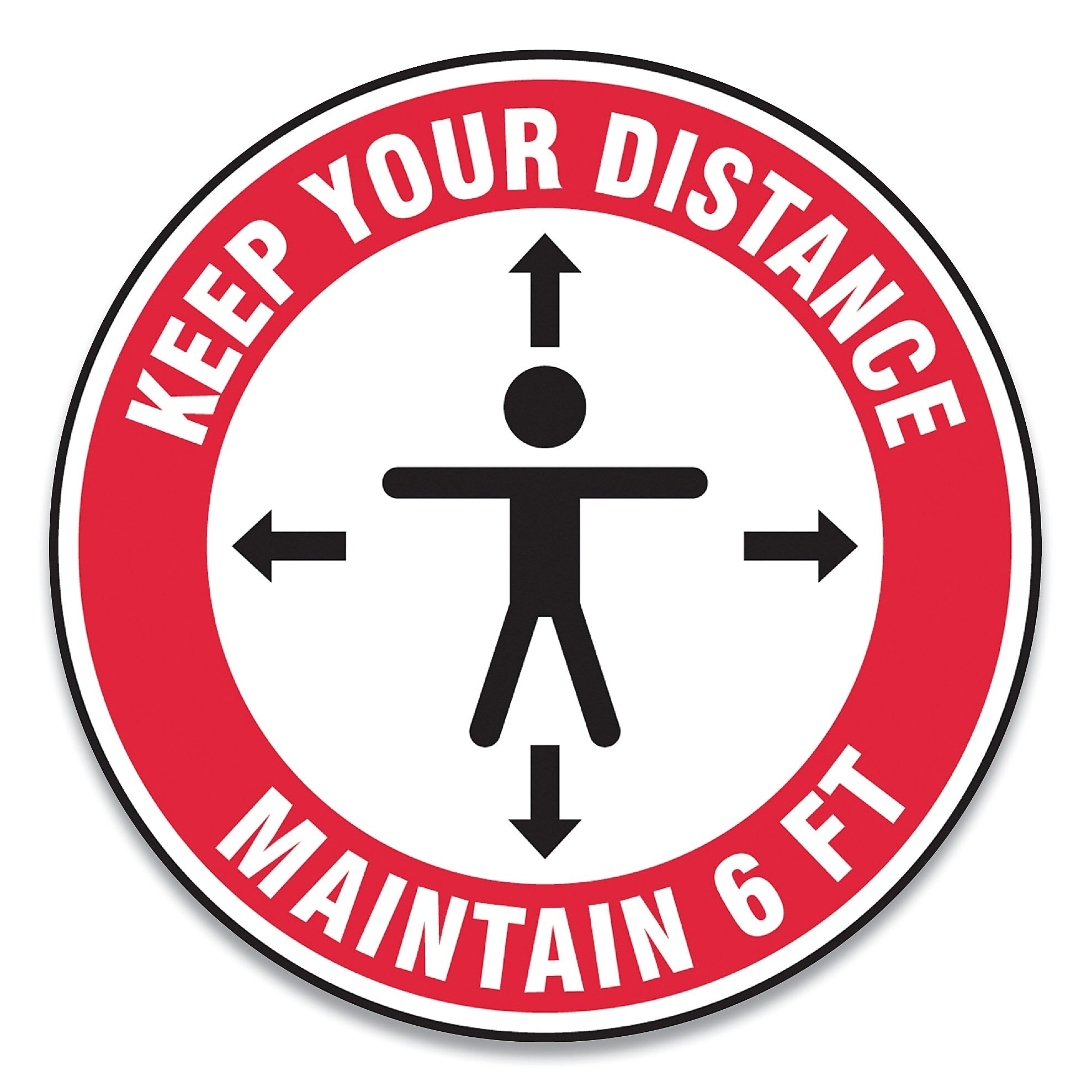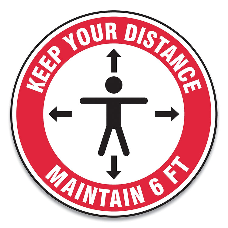 Accuform Slip-Gard Social Distance Floor Signs, 12" Circle, "Keep Your Distance Maintain 6 ft", Human/Arrows, Red/White, 25/Pack