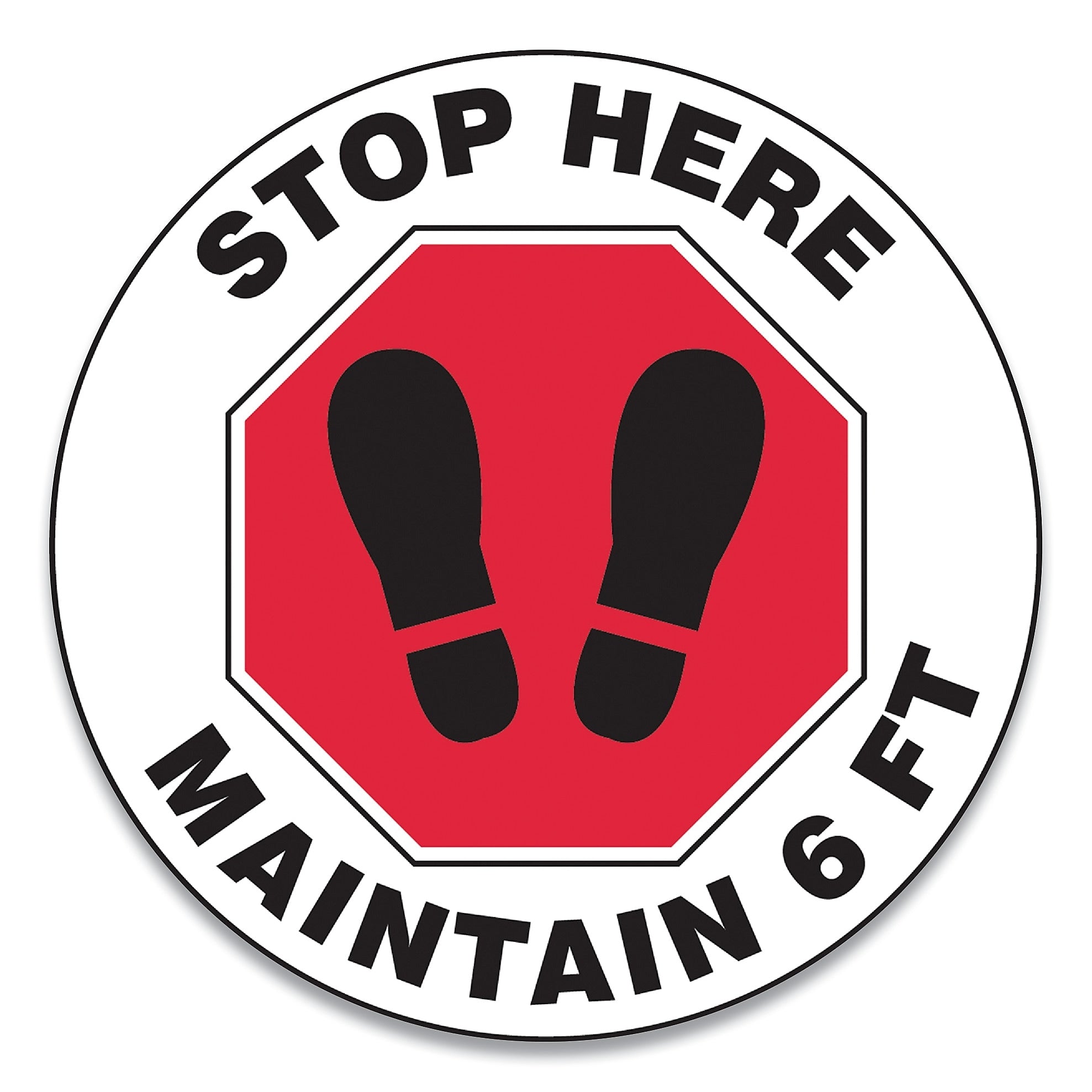 Accuform Slip-Gard Social Distance Floor Signs, 12" Circle, "Stop Here Maintain 6 ft", Footprint, Red/White, 25/Pack