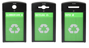 - 3-Stream recycling station includes three 40-gallon bins with slot opening, mixed slot, and circular openings to separate different kinds of recycling