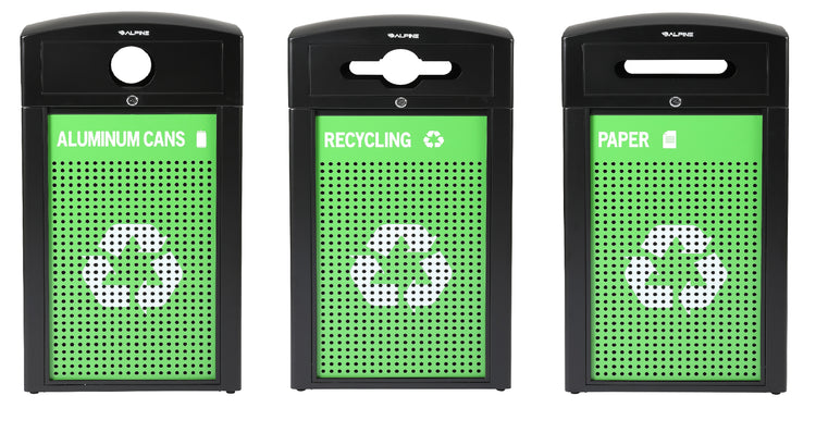 When equipping your business’s exterior with waste receptacles, you want to be reassured that it will last in the harshest weather conditions but is also aesthetically pleasing. With our 120-gallon all-weather recycling bin combo station, you can check off both qualities. Our receptacle features a prominent white recycling symbol on the panels, a large section to display the included stickers and a circular opening to dispose of aluminum cans, bottles, and a mixed slot and regular slot opening to separate out other recycling material properly. Its weather-resistant powder-coated steel frame and lid will ensure its longevity while maintaining its quality. Additionally, its solid dome lids allows rain to glide off quickly and not pool, decreasing the likelihood of corrosion. The included heavy-duty plastic interior bins will securely hold trash bags without worrying about leaks. Since your terrain isn’t always guaranteed to be perfectly flat, we have outfitted our trash container with adjustable legs. They will help certify stability and support on uneven surfaces. The Alpine recycle outdoor receptacle is vital to keeping your facilities clean and elevating your aesthetic. We understand that sometimes things happen, such as theft or vandalism; therefore, we’ve equipped each trash container with a lock and key to help protect your investment. Includes two chain-link security chains that prevent your lid from falling when opened.