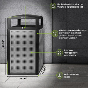 Trash Can Feature | Slotted bottom, Dome lid with open sides, anchor kit, adjustable legs, indoor and outdoor use |