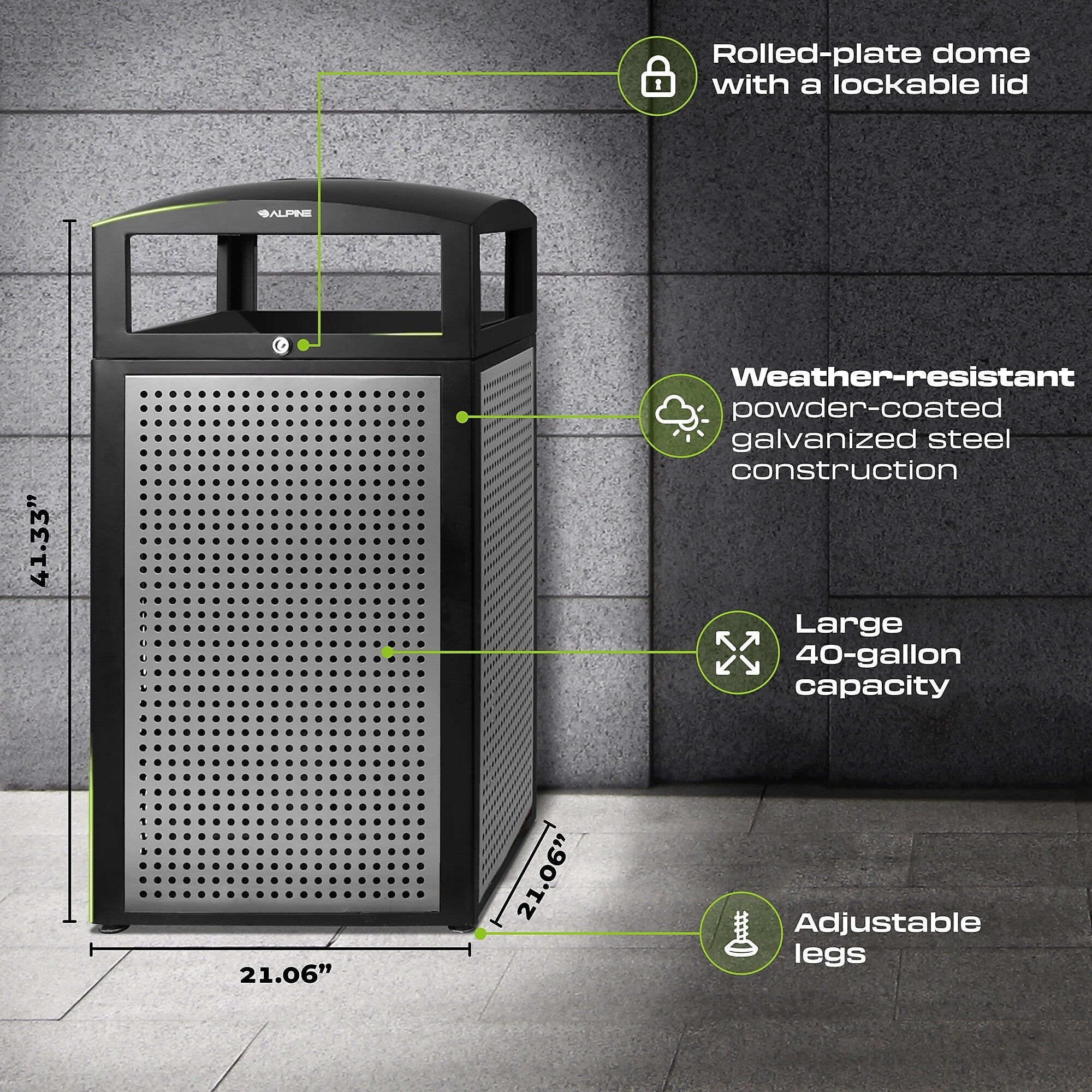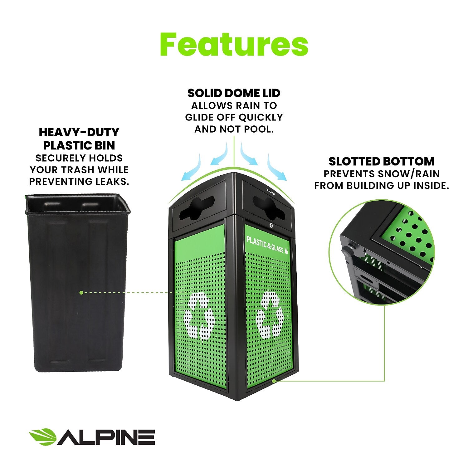 When equipping your business’s exterior with waste receptacles, you want to be reassured that it will last in the harshest weather conditions but is also aesthetically pleasing. With our 80-gallon all-weather recycling trash station, you can check off both qualities. Our receptacle features a prominent white recycling symbol on the panels, a large section to display the included stickers and a mixed opening to dispose of aluminum cans, bottles, and other recycling material properly. Its weather-resistant powder-coated steel frame and lid will ensure its longevity while maintaining its quality. Additionally, its solid dome lids allows rain to glide off quickly and not pool, decreasing the likelihood of corrosion. The included heavy-duty plastic interior bins will securely hold trash bags without worrying about leaks. Since your terrain isn’t always guaranteed to be perfectly flat, we have outfitted our trash container with adjustable legs. They will help certify stability and support on uneven surfaces. The Alpine trash and recycle outdoor receptacle combo station are vital to keeping your facilities clean and elevating your aesthetic. We understand that sometimes things happen, such as theft or vandalism; therefore, we’ve equipped each trash container with a lock and key to help protect your investment. Includes two chain-link security chains that prevent your lid from falling when opened.
