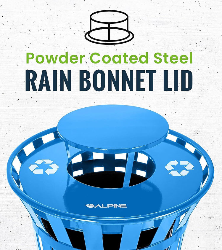 The Alpine rain bonnet lid is the perfect companion for the Alpine 38 gal. outdoor metal recycling receptacle. This is a cost-effective accessory that stops your waste receptacle from being flooded with rain and snow. The fully welded lid receives full coverage with a polyester powder coating that seals it against the harsh natural elements. The lid will leave you with a long-lasting polished finish that also detracts against vandalism.