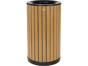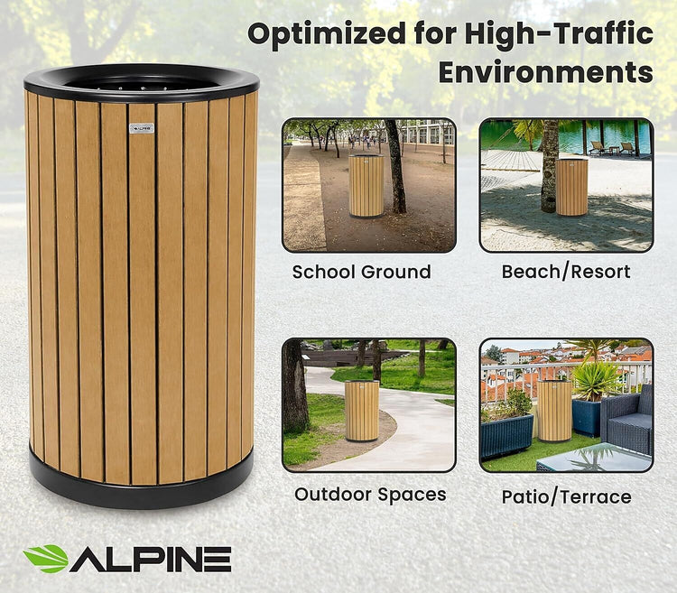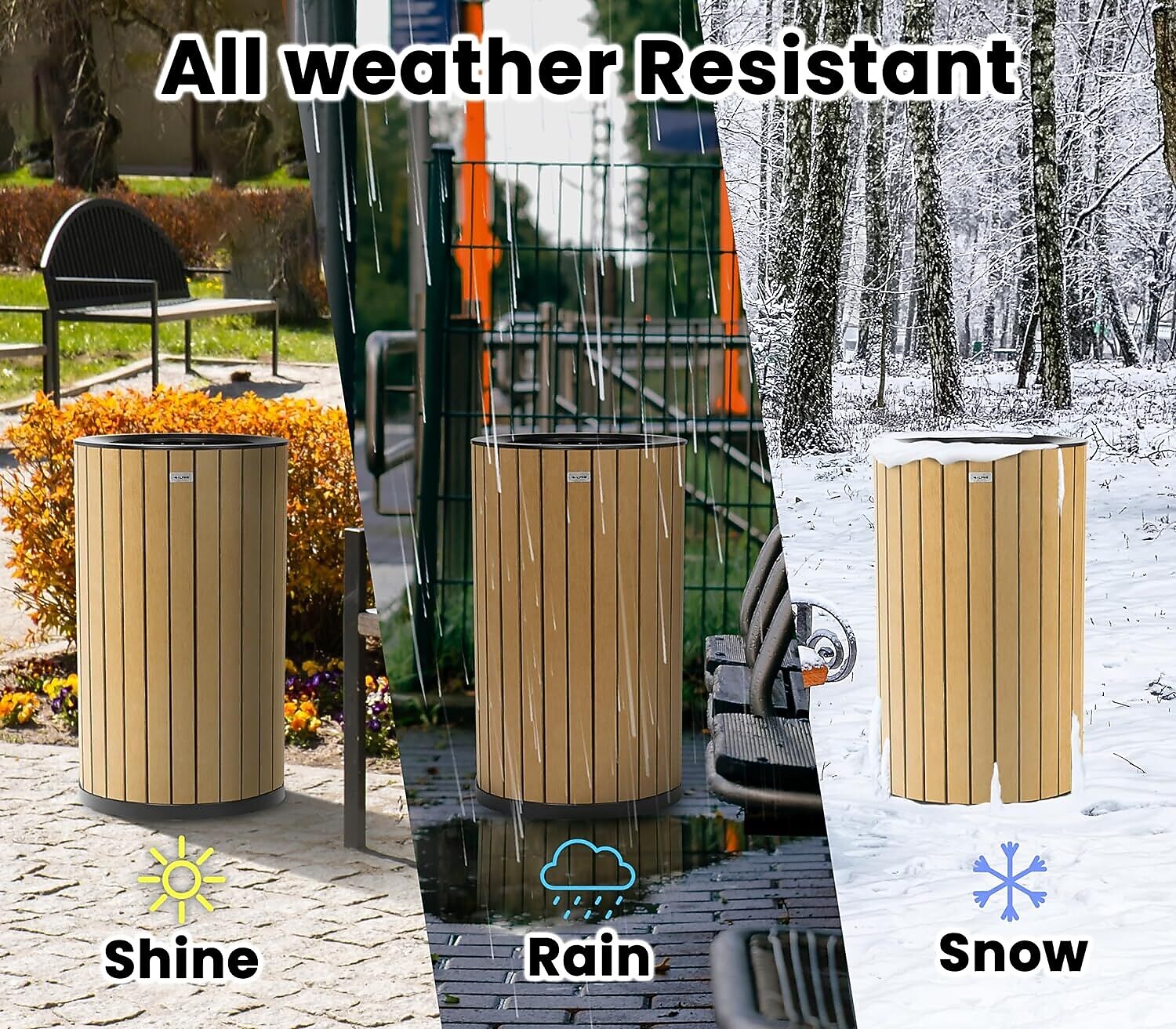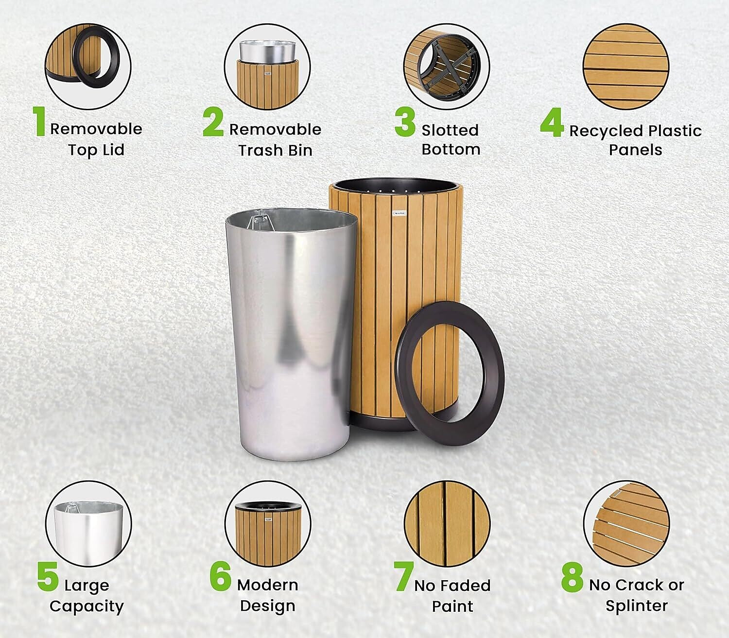 - The outdoor trash can features a recycled plastic cedar exterior that adds an earthy and a natural aesthetic, allowing it to blend seamlessly into its outdoor environment