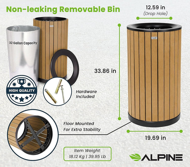 Alpine Industries Steel Outdoor Trash Can with Open Lid, 32 Gallon, Cedar (ALP4400-01-CD)
