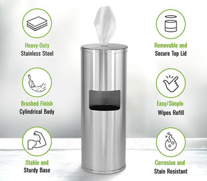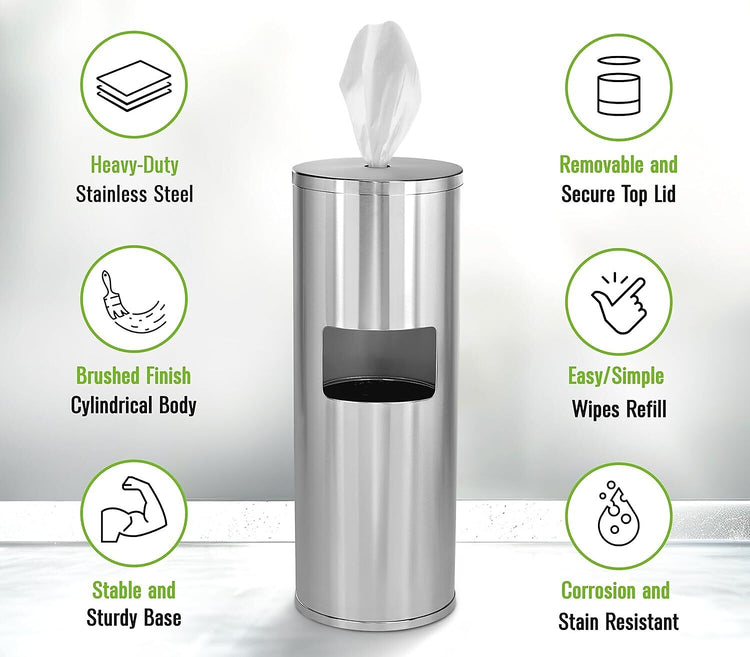 - This wet wipes dispenser and trash can keep areas clean and germ free and the stainless steal build will last you years to come