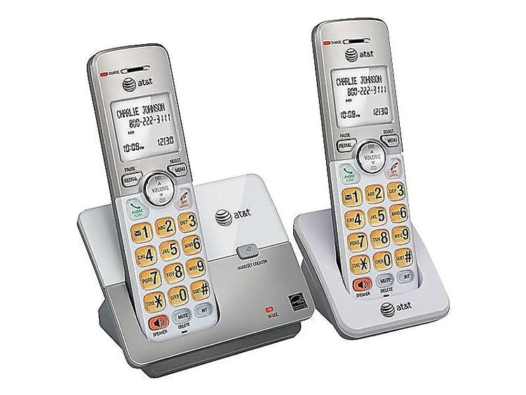 Outfit your small office with this AT&T DECT 6.0 silver two-handset expandable cordless phone set. The extra-large display makes incoming calls easy to see, while the large lit buttons allow for effortless dialing. Caller ID, call waiting and redial options make these phones ideal for use in busy office environments. This AT&T DECT 6.0 silver two-handset expandable cordless phone set comes with two compact charging cradles, taking up minimal space on desks or tables. This system features an easy to read LCD screen on the cordless handsets. Also features high contrast black text on a white background, which provides for an easy to read screen to view incoming caller ID or review call history. The phonebook directory allows you to program up to 50 names and associated phone numbers in the handset so you can easily access the entries by scrolling alphabetically or entering the first few letters of the name.