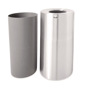 This container is open for business. A 9" dia. opening provides plenty of area through which trash can be dropped. Fire-safe construction. Durable baked-on polyester finish withstands hard use. Lift-off top holds and conceals poly bag. Corrosion-resistant.