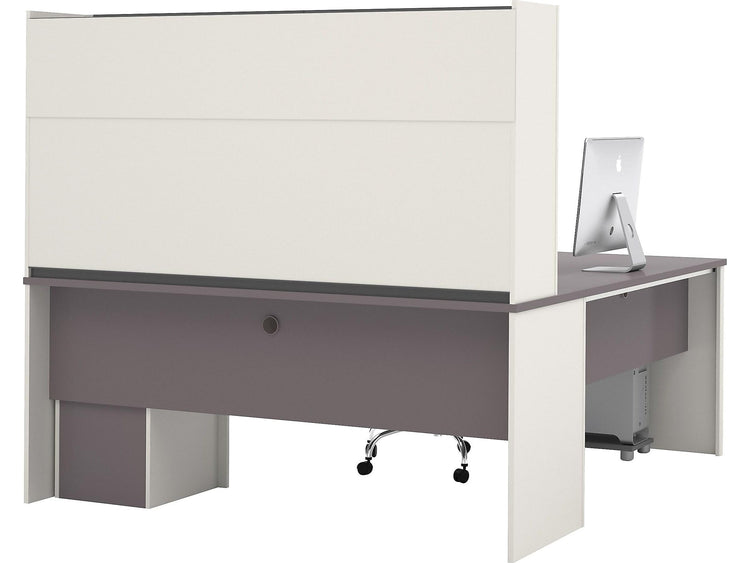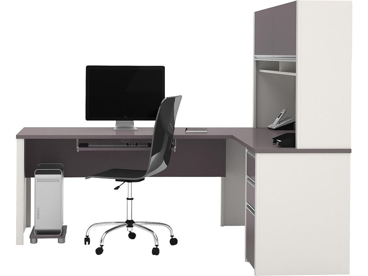 Upgrade your office with this L-shaped workstation. The attached hutch features two large concealed storage cabinets and two paper shelves, providing plenty of storage and organization options. A file drawer and two box drawers keep office supplies and important files within arm's reach, and an integrated cable management system keeps cords and wires neatly tucked away. This bestar Connexion L-shaped workstation features a melamine finish and impact-resistant PVC edge to withstand everyday wear and tear.