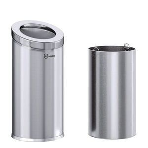 Streamline your waste management with our stainless steel beveled open top trash can. The easy-access open top lid allows for quick disposal, while the slanted lid design prevents trash accumulation. The galvanized steel removable inner bucket, complete with handles, ensures hassle-free emptying. With its durable and attractive stainless steel exterior, this trash can combines style with practicality. The snug-fit lid keeps the full bag securely in place.