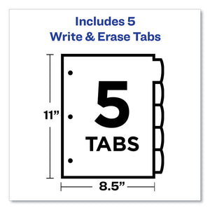 Write & Erase durable plastic dividers let you write, erase and reuse your dividers for easy changes at any time. Simply write directly on the tabs with a ballpoint pen or pencil, and erase as needed. You can also take quick notes on the divider body and easily erase later. Made from ultra-durable, tear-resistant plastic, these dividers are ideal for frequent use in any three-ring binder. The Big Tab™ design offers 1.5 times more writing space than standard divider tabs, and the multiple colors allow for quick referencing. Ideal for your personal organization at home, work and school.