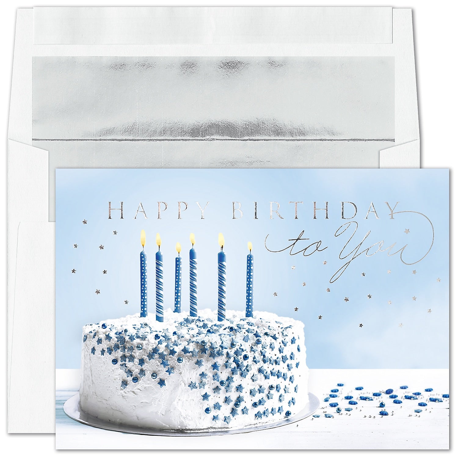 Who wouldn’t want a slice of the cake on this classic birthday card? Silver foil accents on a blue background add sparkle and shine.