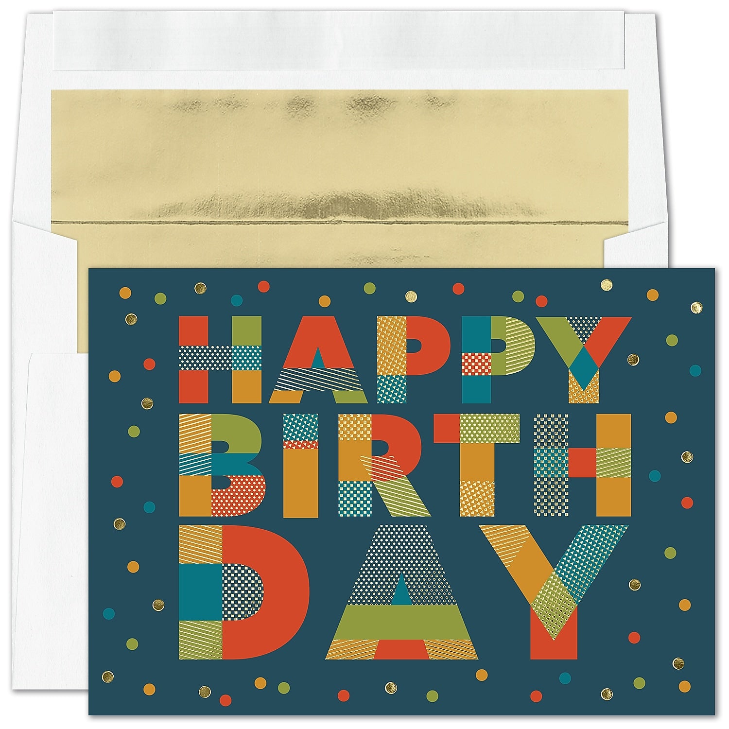 Here's a birthday card that will get a closer look! Colorful typography is decorated with patterns of tiny squares, dots, and triangles stamped in shiny gold foil.