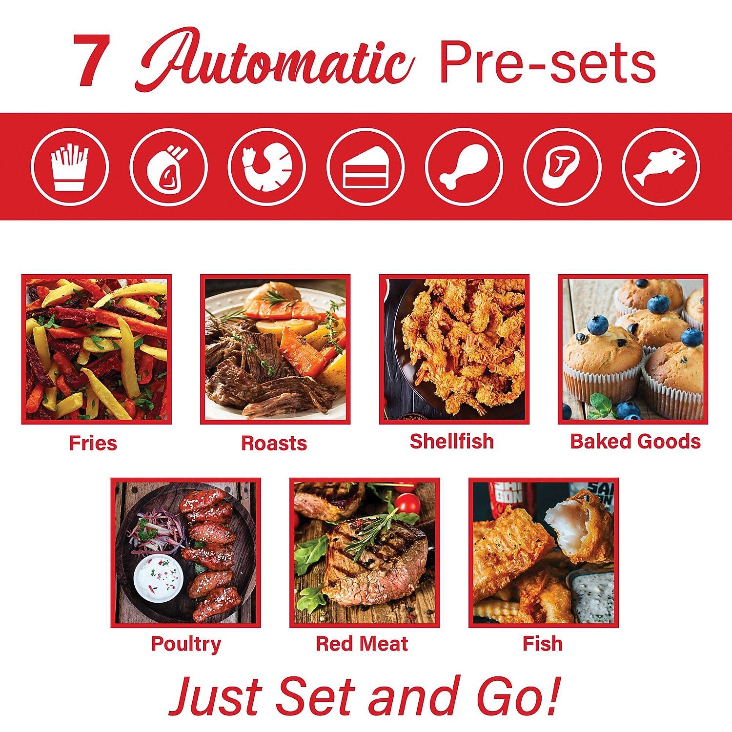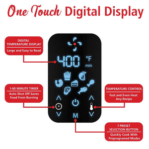 - Uses little or no oil to fry food with fast and even heat