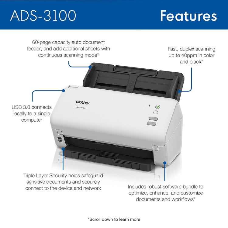 Small but mighty, the easy-to-use, affordable, and efficient Brother ADS-3100 is a powerful addition to any small business or home office workspace. A versatile and reliable solution for mid-volume scanning, the machine scans directly to your computer or to USB and offers Hi-Speed USB 3.0 connectivity. Thanks to the compact size, users can say bye-bye to big and bulky equipment and hello to an organized, efficient workspace in practically any surrounding. From gathering personal banking statements and curating family photos to indexing client invoices and tracking expenses, this desktop scanner includes a robust software bundle. Engineered for exceptional ease of use with a simple and intuitive user interface, the ADS3100 performs single- or dual-sided document scanning, with an impressive capacity of up to 60 pages via the built-in auto document feeder with additional page-continuous scanning. Spend less time waiting and more time scanning. With a speed of up to 40 ppm, the scanner quickly handles a wide variety of media types and paper sizes, including legal-size and long paper, business and plastic ID cards, receipts, and even photos. Bid farewell to frustration, and remove the guesswork from scanning with the built-in auto size detection. Seamlessly transition from scanning smaller items like business cards to longer documents like legal contracts at the touch of a button. This dynamic scanner is ready to go right out of the box. The scanner is compatible with several document management software systems, Windows, macOS, and Linux operating systems, as well as TWAIN, WIA for PC, ICA for MAC, and SANE drivers. Use the scanner with a USB memory stick as a mass-storage device that can scan and retrieve files without installation of proprietary software. Always flexible, reliable, responsive and secure, the Brother ADS3100 is the little scanner that takes the big work out of getting organized and staying organized.