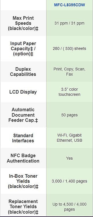 - The MFC-L8395CDW passed the strict security testing protocol of Keypoint Intelligence and earned the Buyers Lab (BLI) Security Validation Testing seal for device penetration to ensure further protection against vulnerabilities in the device firmware / OS, ports, print protocols, embedded web page, connectivity avenues, and other areas.