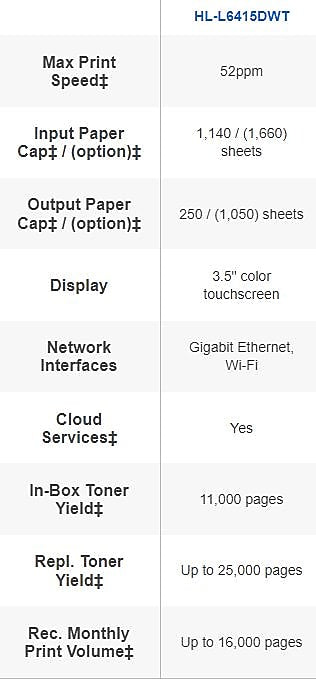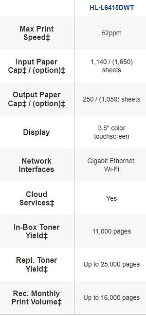 This high-performance printer helps to increase productivity with a fast print speed of up to 52ppm‡. Reduce paper refills with dual 520-sheet capacity paper trays. Add an additional tray for extra capacity as your business needs grow. Delivers built-in value with an included 11,000-page toner cartridge and a low total cost of ownership by using the TN925 Brother Genuine max yield replacement toner cartridge‡. Triple Layer Security features help to limit document and device access and protect against network intrusions. The HL-L6415DWT also provides flexible connectivity with built-in Gigabit Ethernet and dual band wireless networking, plus convenient mobile device printing to meet mobile workforce demands‡.