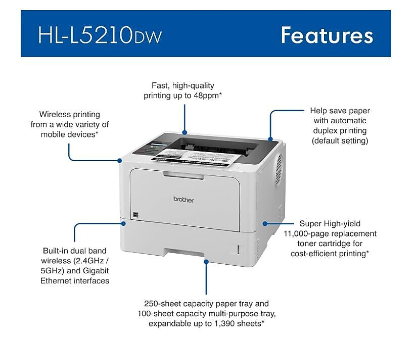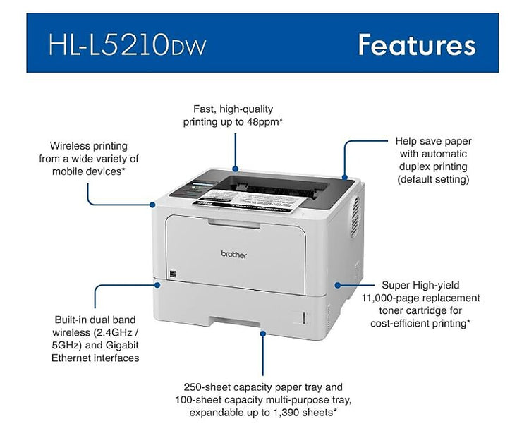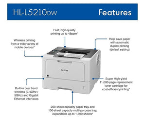 Brother HL HL-L5210DW Desktop Wireless Laser Printer - Monochrome - 48 ppm Mono - 1200 x 1200 dpi Print - Automatic Duplex Print - 350 Sheets Input - Ethernet - Wireless LAN - Wi-Fi Direct - 90000 Pages Duty Cycle - Plain Paper Print - Gigabit Ethernet - USB