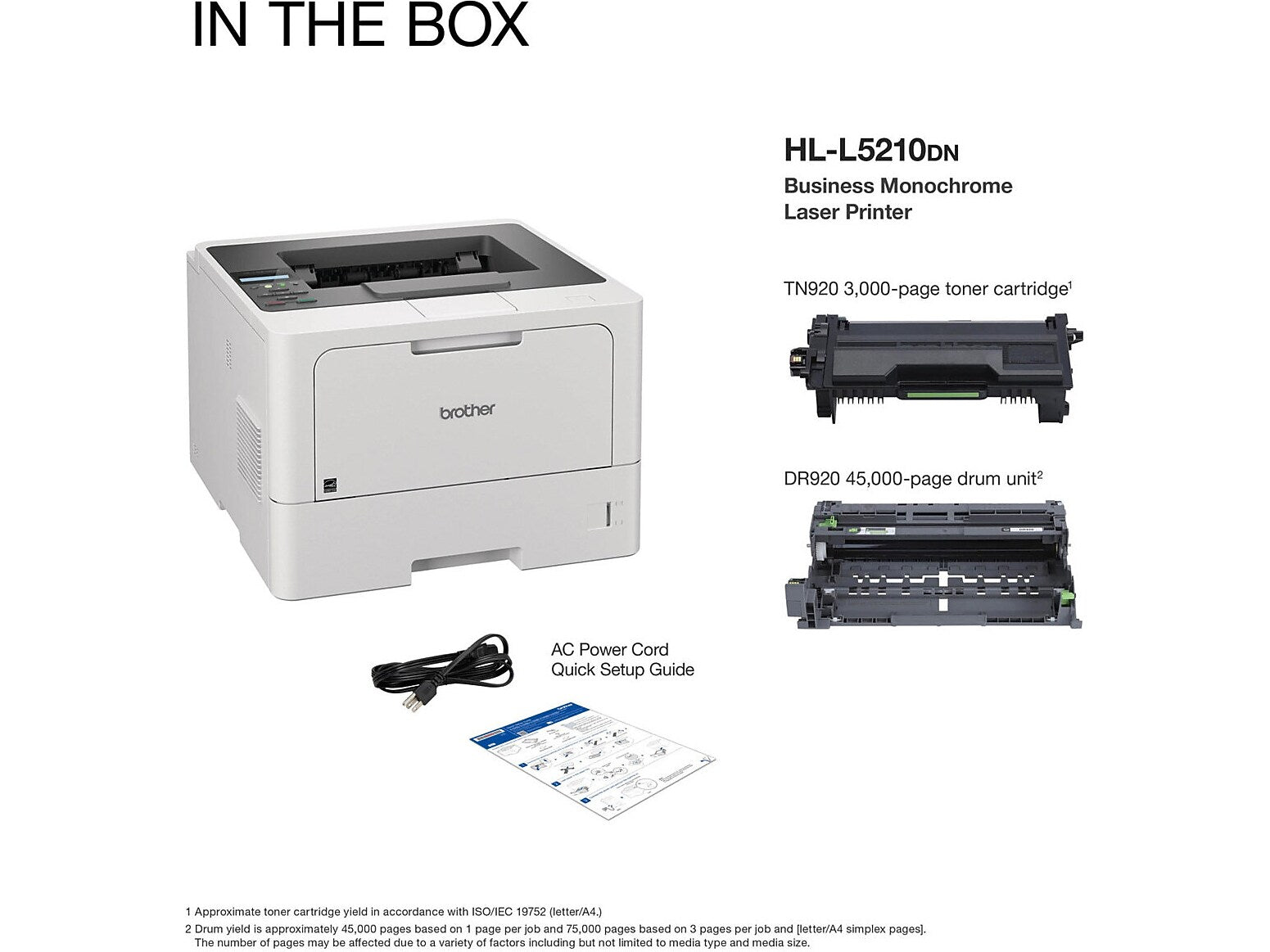 The Brother HL-L5210DW business monochrome laser printer is a great choice for busy offices and small workgroups that need cost-efficient printing, versatile paper handling, advanced security features, and reliable, high-quality output. This high-performance printer helps to increase productivity with a fast print speed of up to 48ppm(1). Delivers cost-efficient printing by using the Brother Genuine TN920XXL super high-yield replacement toner cartridge. Triple Layer Security features help to limit document and device access and protect against network intrusions. Offers expandable paper capacity that is scalable as your business needs grow. The HL-L5210DW also provides flexible connectivity with built-in Gigabit Ethernet and dual band wireless networking, plus convenient mobile device printing to meet mobile workforce demands(2).