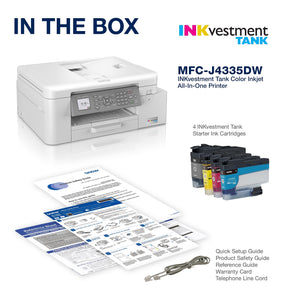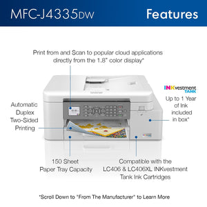 The Brother INKvestment Tank MFC-J4335DW color inkjet all-in-one wireless printer with automatic duplex printing and up to one year of ink in-box keeps pace with the growing use of color printing at home, at school, and in the office. Delivering high-quality color and black-and-white prints, the enhanced color graphics and re-engineered ink provide vivid colors making it great for printing photos and color documents. The MFC-J4335DW offers fast print and scan speeds and full print, copy, scan, and fax functionality along with the ability to wirelessly print, copy, and scan. The MFC-J4335DW uses INKvestment Tank ink cartridges that hold more ink than traditional cartridges and work with the printer's internal ink tank. Versatile paper handling includes an up to 20-sheet automatic document feeder, bypass tray, and 150-sheet capacity paper tray. The 1.8" color display enables you to easily navigate to powerful features plus print from and scan to popular cloud services including Google Drive, Dropbox, Box, OneDrive, and more, directly from the printer.