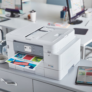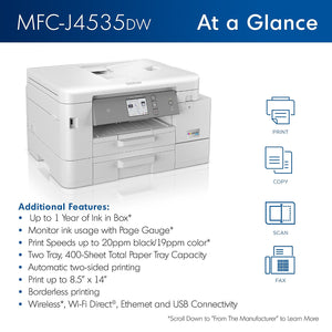Print, copy, scan, and fax functionality, a generous 2.7" touchscreen display, and two adjustable paper trays for up to a 400-page total capacity help make the Brother MFC-J4535DW all-in-one color inkjet printer the ultimate INKvestment Tank printer for your home, home office, schoolwork, or small business. Additional paper-handling options include an up to 20-sheet automatic document feeder for fast copying and scanning along with a bypass tray to handle a variety of media. The MFC-J4535DW also offers versatile connection options with NFC touch-to-print, built-in wireless, Wi-Fi Direct, Ethernet, or connect it locally to a single computer via USB interface. The MFC-J4535DW is supported by the Brother Mobile Connect app providing a convenient user interface that enables printing, scanning, copying, and device management from your smartphone or tablet. The MFC-J4535DW features fast print and scan speeds, along with the ability to wirelessly print, copy, and scan, along with duplex printing and enough ink for up to one year of printing with just the ink included in-box.