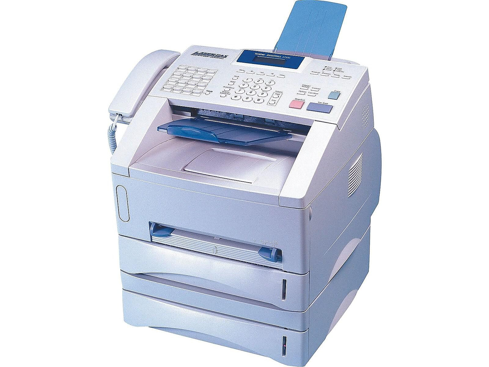 Send faxes, make copies and print documents with this monochrome laser fax machine. Boasting transmission speeds as fast as 2 seconds per page, this fax machine quickly sends documents to up to 282 recipients at once. Integrated USB connectivity lets you send faxes and print documents from flash drives, while the integrated Ethernet connectivity offers remote printing and PC faxing. Store up to 600 fax pages using the 8MB of memory, and use the convenient activity report feature to keep track of what you've sent and received. A built-in copier and advanced laser printing technology deliver up to 15 pages of crisp, detailed output per minute, ideal for reproducing and distributing important documents. Featuring two 250-sheet input trays and a 150-sheet output tray, this Brother IntelliFax fax machine offers uninterrupted performance and keeps faxes in order after printing.