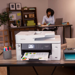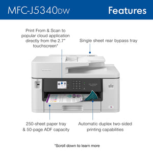 The Brother MFC-J5340DW color inkjet all-in-one printer delivers economical, reliable, and professional-quality printing for any small office or home workspace. A smart choice for users who frequently print, copy, scan and fax, this all-in-one print solution raises the bar on simplicity and productivity. With print speeds up to 28 ppm (black and color) and a 250-sheet paper tray capacity (paper size up to 11" x 17") makes handling large print jobs a breeze. Access features on the go when connected through a wireless network with the free Brother Mobile Connect app. Intuitive cloud connection: print from and scan to popular cloud apps, including Dropbox, Google Drive, Evernote, OneNote and more, directly from the intuitive 2.7" color touch screen. Save time by creating custom shortcuts right on the touch screen for your frequently used features. Connect your way: use built-in dual-band Wi-Fi (2.4GHz/5GHz), Wi-Fi Direct, an Ethernet cable, or even connect to a single computer via USB. Works with Amazon Alexa. Eco-friendly features: the printer is EPEAT Silver and ENERGY STAR certified with eco-friendly options like Eco Mode and Ink Save Mode. Plus, automatic duplex printing helps reduce paper use. Backed by Brother with a 2-year limited warranty, plus free online or live chat support for the life of your Brother printer.