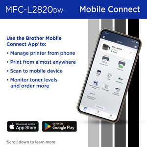 - PRINT FROM VIRTUALLY ANYWHERE. Print, scan, and manage your printer anytime, from almost anywhere with the Brother Mobile Connect app. Order Brother Genuine Supplies, track toner usage, and complete more work on-the-go.(7)