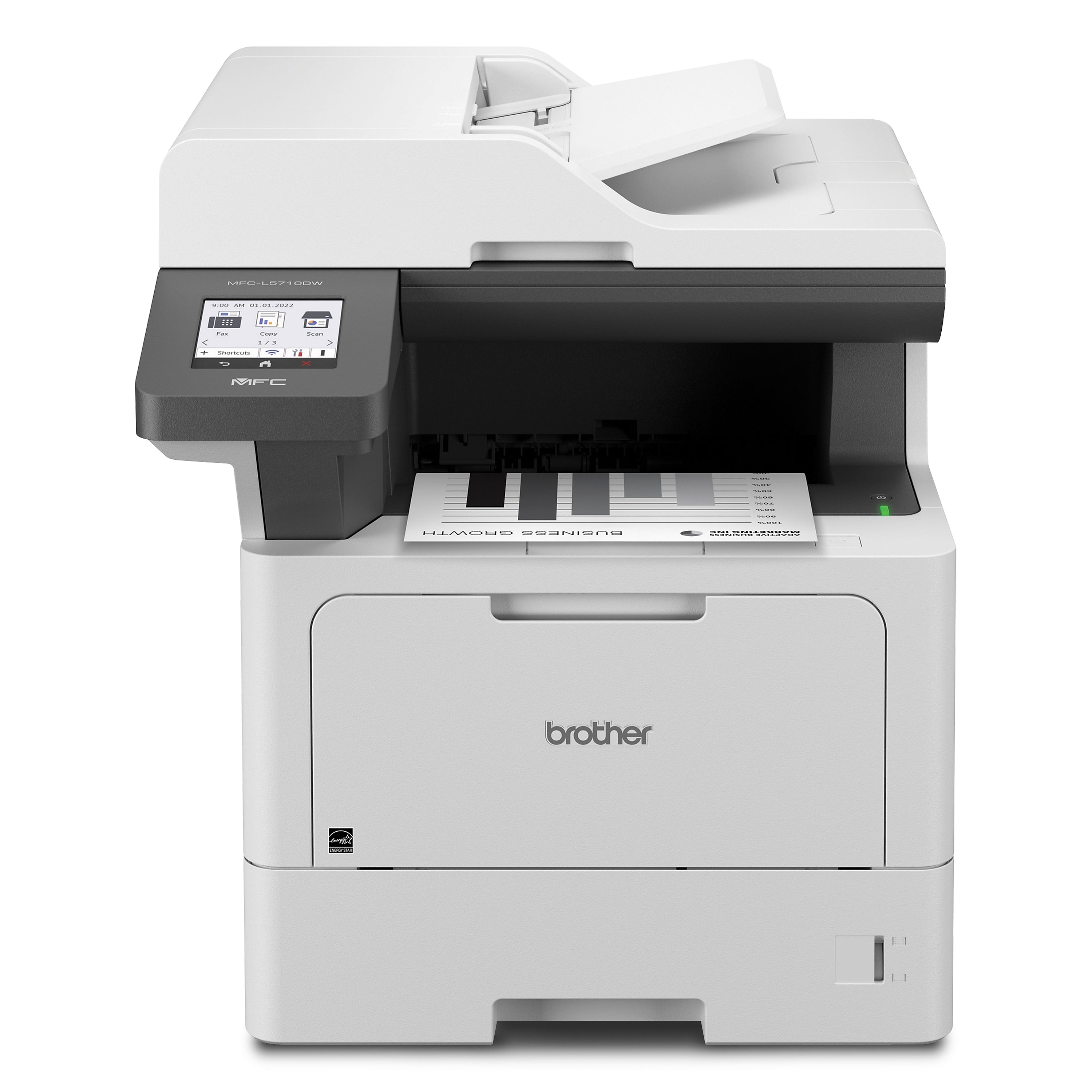 This high-performance all-in-one printer helps to increase productivity with fast print and copy speeds up to 48ppm(1). Delivers cost-efficient printing by using the Brother Genuine TN920XXL super high-yield replacement toner cartridge. Triple Layer Security features help to limit document and device access and protect against network intrusions. Offers expandable paper capacity that is scalable as your business needs grow. Quickly scan multi-page documents to a wide variety of destinations using the 50-page capacity(2) auto document feeder. The 3.5” touchscreen display allows for the creation of customized shortcuts to your most frequently used workflows. The MFC-L5710DW also provides flexible connectivity with built-in Gigabit Ethernet and dual band wireless networking, plus convenient mobile device printing to meet mobile workforce demands(3).