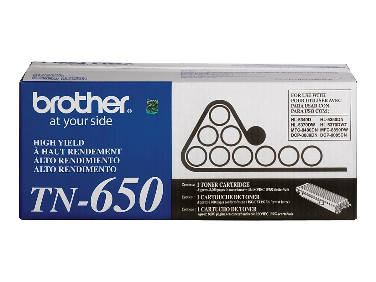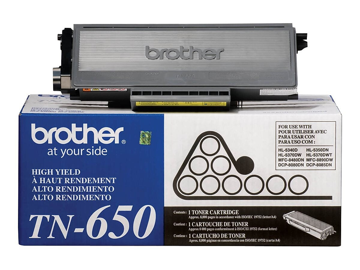 Handle every printing job in the office with this black toner cartridge for select Brother laser printers. The deep black toner creates easy-to-read text, making it ideal for contracts, reports and other documents. With a 8,000-page yield, this Brother TN650 toner cartridge provides reliable daily function.