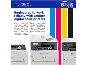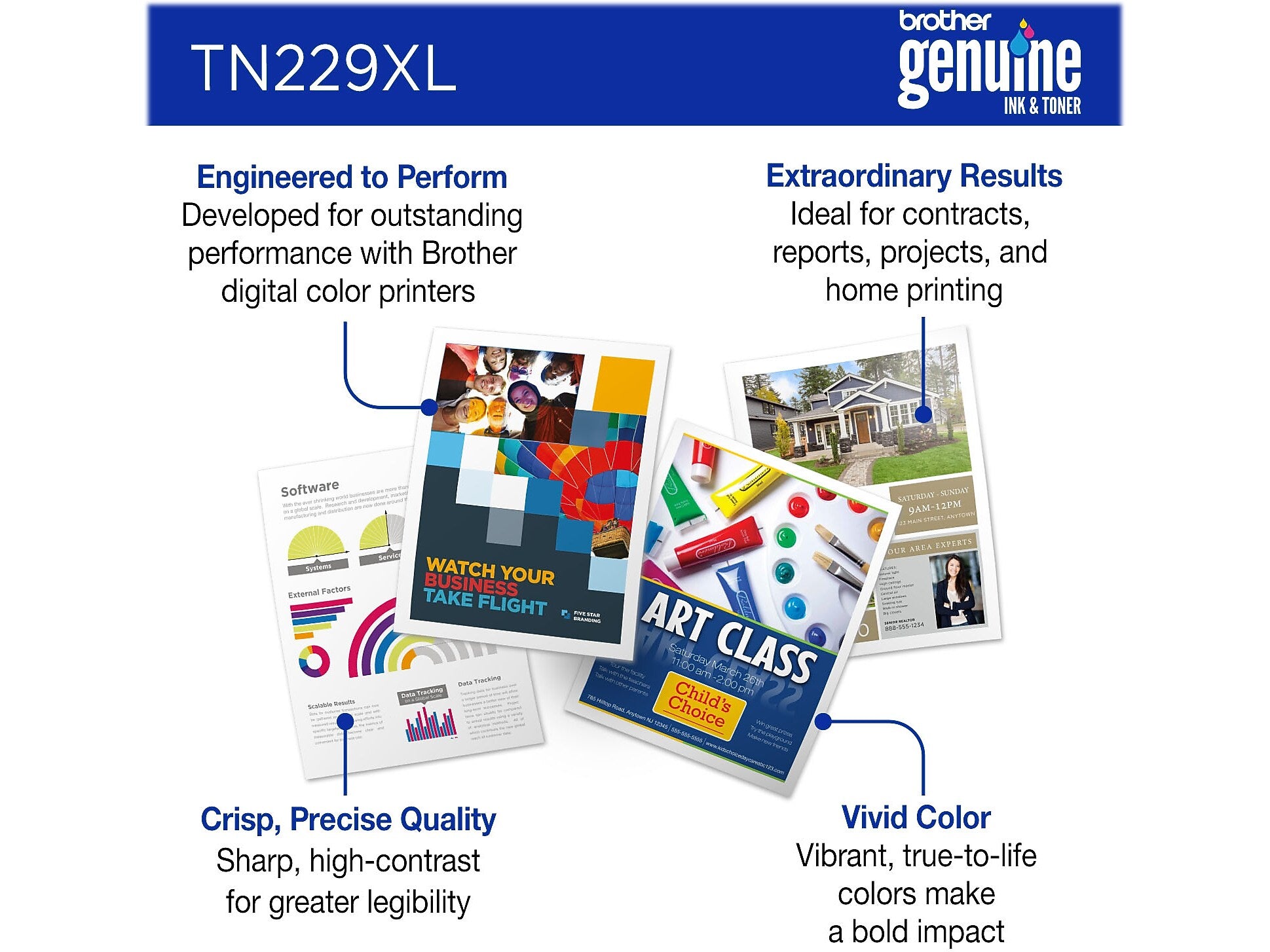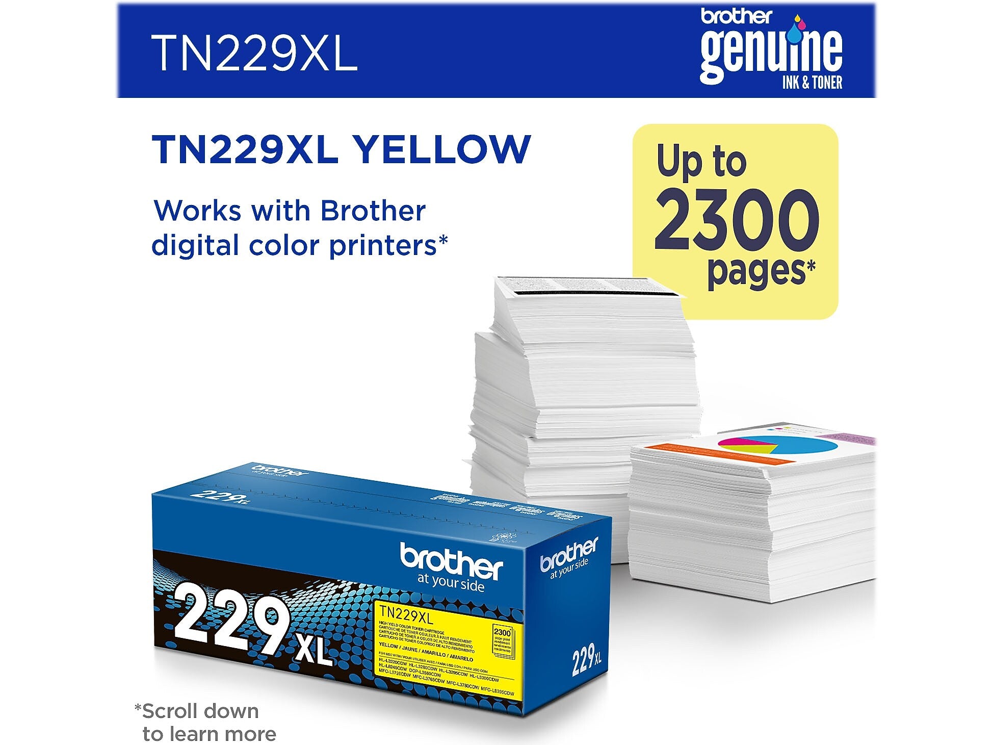 Print confidently with the Brother genuine TN229XL high-yield yellow toner cartridge. This toner produces yellow tones on every page while providing reassuring compatibility, as well as convenience and cost savings. Brother genuine is the only toner brand recommended for Brother multifunction and all-in-one digital color printers. Perfect for higher volume printing, the TN229XL delivers dependable, professional results with an up to 2300-page yield (approximate toner cartridge yields in accordance with ISO/IEC 19798). The Brother genuine toner is the trusted choice for creating professional, laser-quality business documents that demand attention and get noticed.