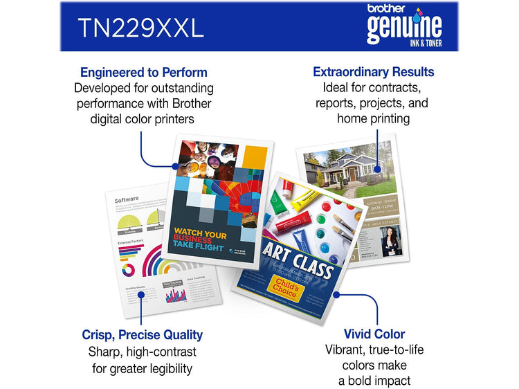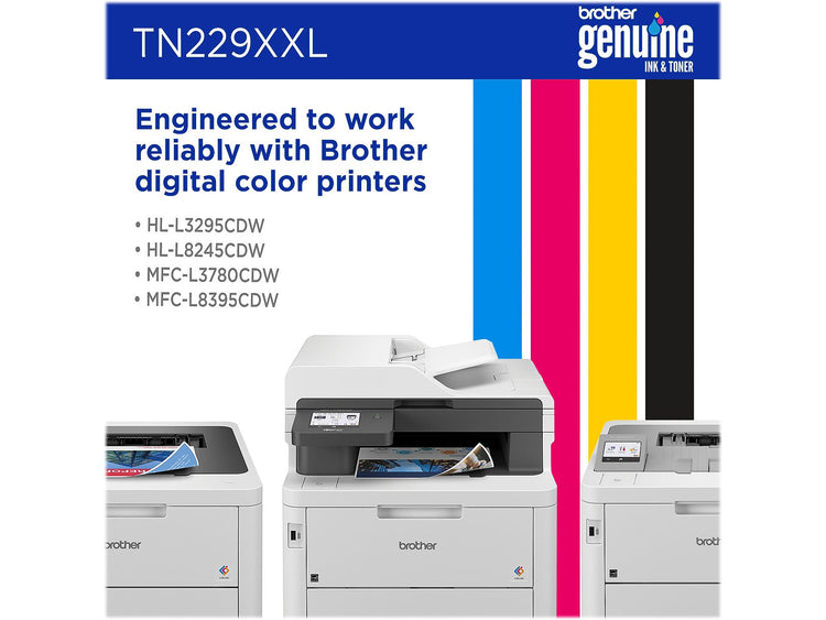 Print confidently with the Brother genuine TN229XXL superhigh-yield magenta toner cartridge. This toner produces magenta tones on every page while providing reassuring compatibility, as well as convenience and cost savings. Brother genuine is the only toner brand recommended for Brother multifunction and all-in-one digital color printers. Perfect for higher volume printing, the TN229XXL delivers dependable, professional results with an up to 4000-page yield (approximate toner cartridge yields in accordance with ISO/IEC 19798). The Brother genuine toner is the trusted choice for creating professional, laser-quality business documents that demand attention and get noticed.