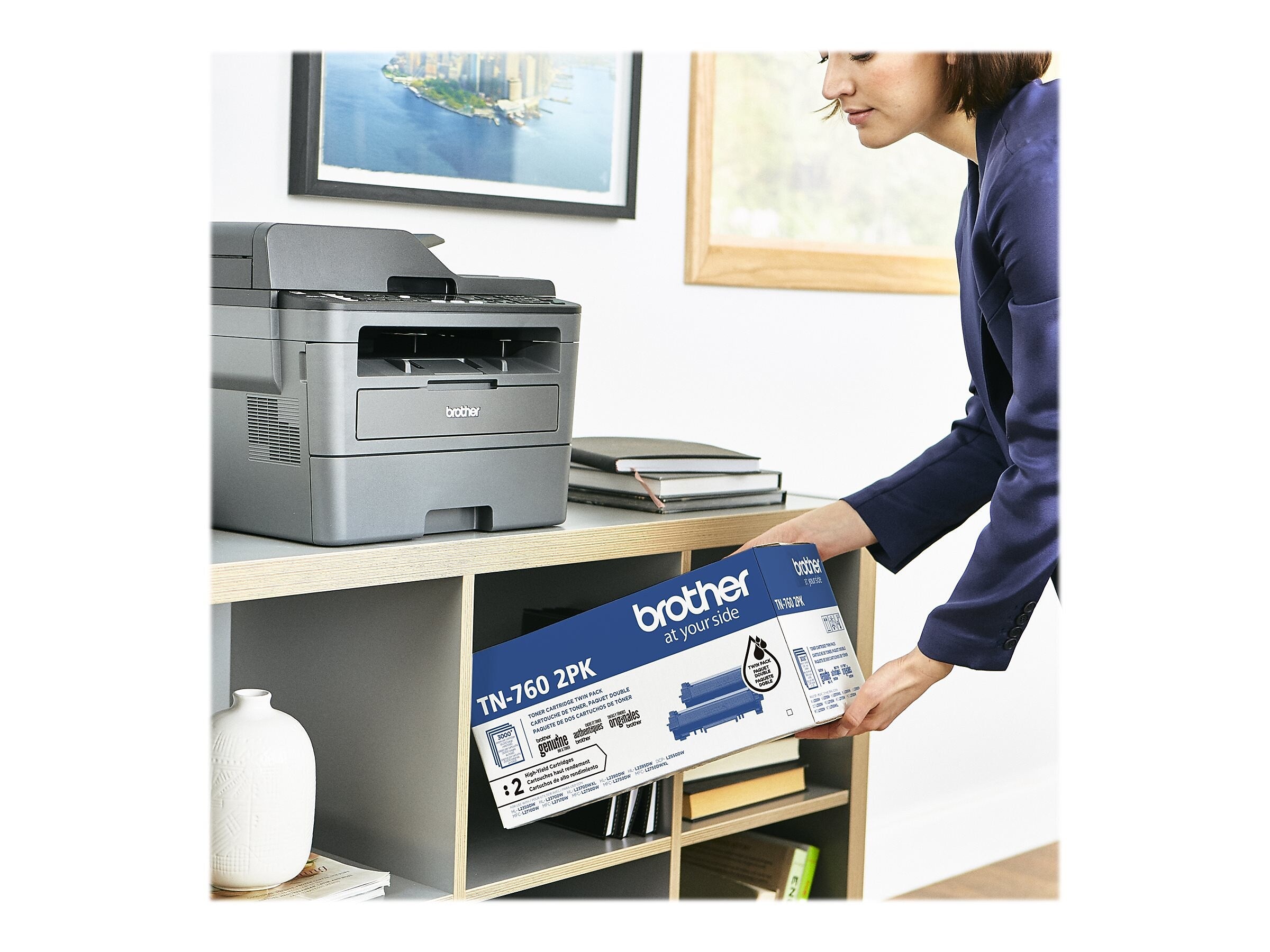 Brother Genuine High-Yield Black Toner Cartridge Twin Pack TN760 2PK contains two TN760 black toner cartridges that deliver consistent, professional laser-quality prints you can rely on for up to 3,000 pages per cartridge (Approximate toner cartridge yields in accordance with ISO/IEC 19752 (Letter/A4)). for a total of up to 6,000 pages.(Approximate toner cartridge yields in accordance with ISO/IEC 19752 (Letter/A4).) The Brother Genuine laser toner 2-pack offers extra convenience - having an extra toner cartridge on hand and printing twice as many pages when you use both toner cartridges.(Approximate toner cartridge yield for TN760 is up to 3,000 pages per cartridge for a total of up to 6,000 pages for two cartridges.) Brother Genuine laser toner is intelligently engineered to work seamlessly with your Brother printer to consistently deliver sharp, crisp laser-quality prints that withstand the test of time. Using Brother Genuine multi-pack laser toner offers convenience and helps minimize the number of repeat toner orders you need to place. Brother offers an environmentally responsible way for customers to dispose of Brother Genuine cartridges. Brother Genuine High-Yield Black Toner Cartridge Twin Pack TN760 2PK is for use with: DCP-L2550DW, HL-L2350DW, HL-L2370DW, HL-L2370DW XL, HL-L2390DW, HL-L2395DW, MFC-L2710DW, MFC-L2717DW, MFC-L2750DW, MFC-L2750DW XL.