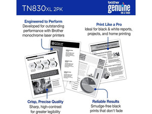 Brother TN830XL Black High Yield Toner Cartridge 2/Pack (TN830XL2PK), print up to 3,000 pages
