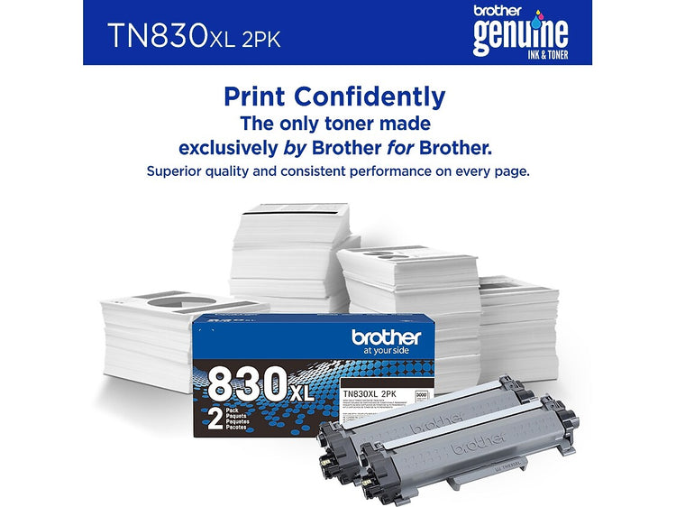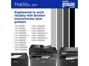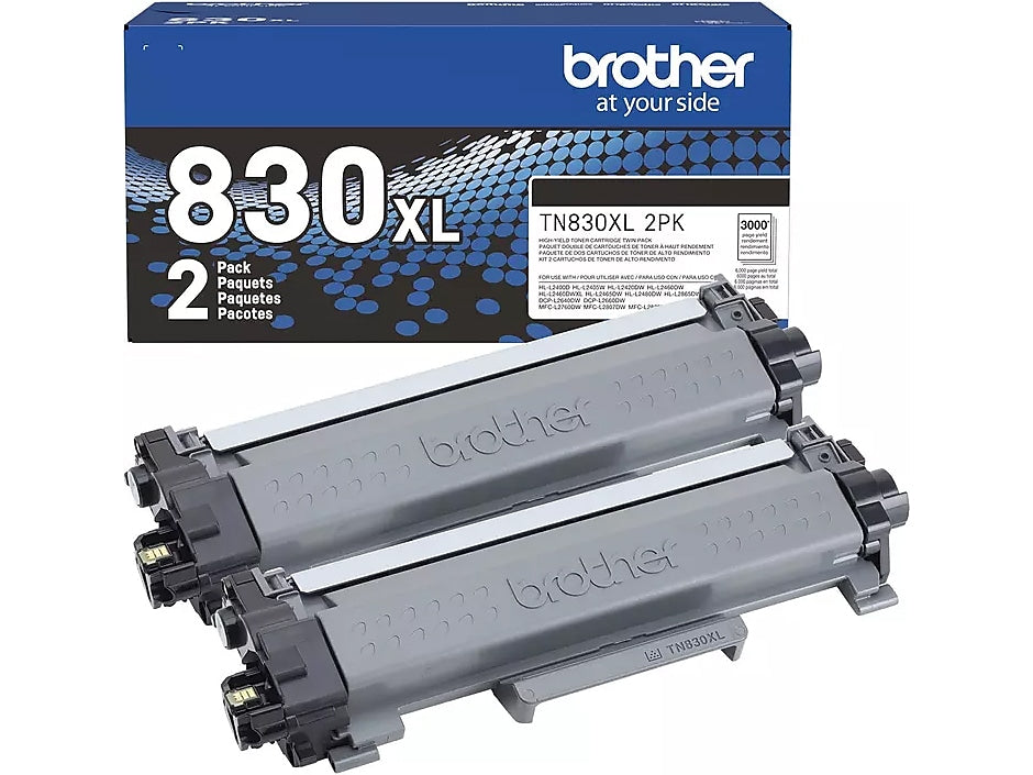 With two TN830XL black toner cartridges, this sensible, convenient twin-pack is an ideal option for uninterrupted printing. Each cartridge produces crisp, precise results with a yield of up to 3,000 pages — up to 6,000 pages in total.(1) The TN830XL twin-pack combines lower per-page print costs with the convenience of fewer cartridge changes compared to Standard Yield TN830 cartridges. Dependably compatible with select Brother monochrome laser printers, Brother Genuine Toner is the reliable choice for professional documents and personal paperwork. When you need to replace your printer’s toner cartridge, choose the worry-free experience of Brother Genuine, the only toner brand recommended for Brother printers. Use with: HL-L2400D, HL-L2405W, HL-L2420DW, HL-L2460DW, HL-L2460DW XL, HL-L2465DW, HL-L2467DW, HL-L2480DW, HL-L2865DW, DCP-L2640DW, DCP-L2647DW, MFC-L2760DW, MFC-L2807DW, MFC-L2820DW, MFC-L2820DW XL, MFC-L2900DW, MFC-L2900DW XL, and MFC-L2980DW.