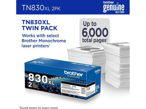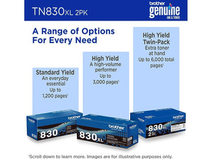 - EFFICIENCY MEETS STOCK-UP SAVINGS. This high yield twin-pack delivers yields up to 3,000 pages/cartridge, up to 6,000 total pages(1). Enjoy lower per page print costs and the convenience of fewer replacements, compared to standard TN830 cartridges.
