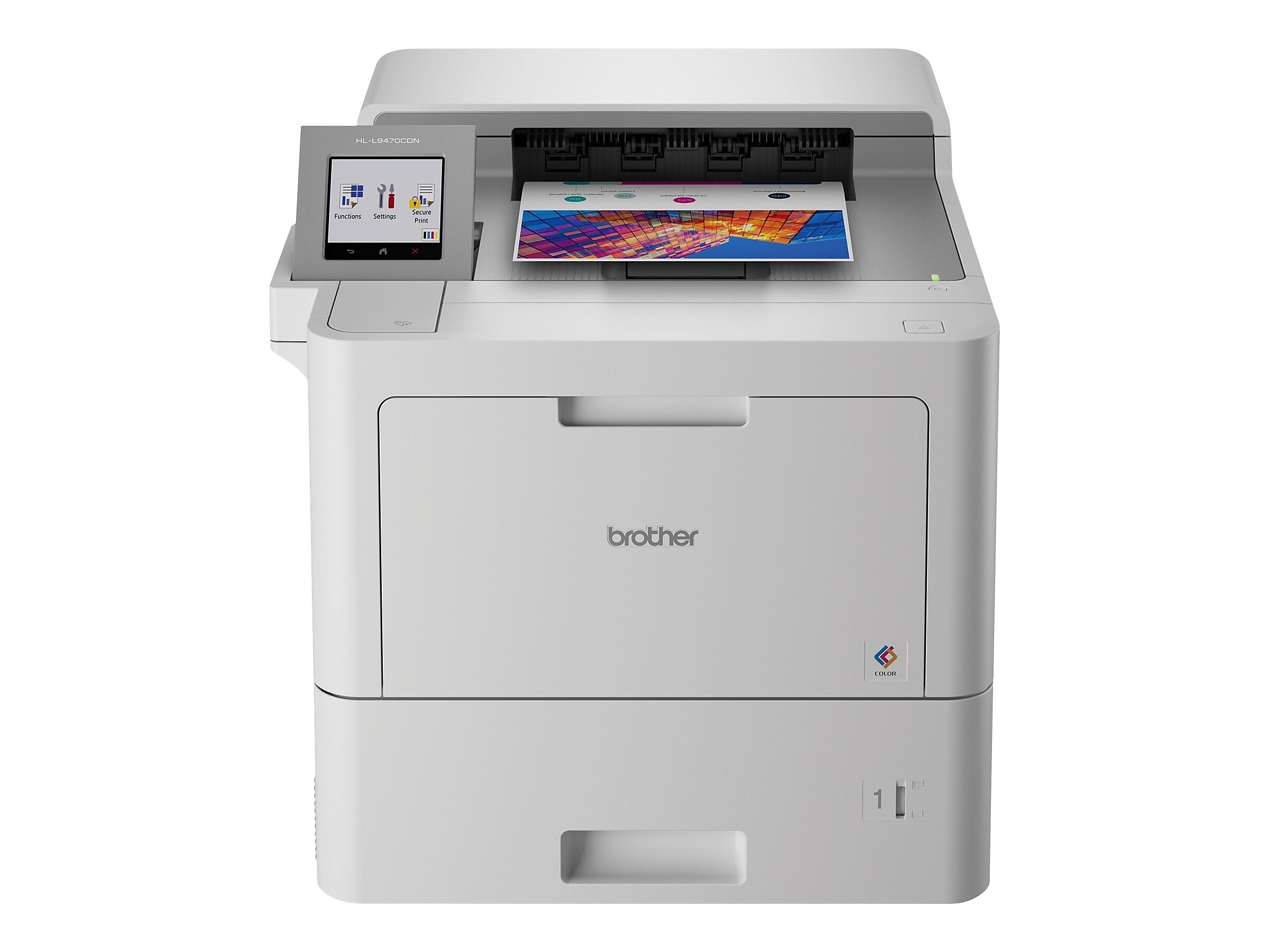 The Brother Workhorse HL‐L9470CDN Enterprise Color Laser Printer is designed for how work now works – providing enterprise‐level performance, advanced security features, and bold color output in a compact footprint that is ideal for mid to large‐sized workgroups. This high-performance printer helps to increase productivity with fast print speeds up to 42ppm(1) in both simplex and duplex. Offers built‐in value with included standard‐yield toner cartridges and a low total cost of ownership by using Brother Genuine TN815 super high‐yield replacement toner cartridges. Triple Layer Security features help to limit document and device access and protect against network intrusions. Offers a large standard paper capacity that is scalable as your business needs grow. The HL‐L9470CDN also offers flexible connectivity with Gigabit Ethernet and dual band (2.4GHz / 5GHz) wireless networking, plus convenient printing from mobile devices.(2)Disclaimers: