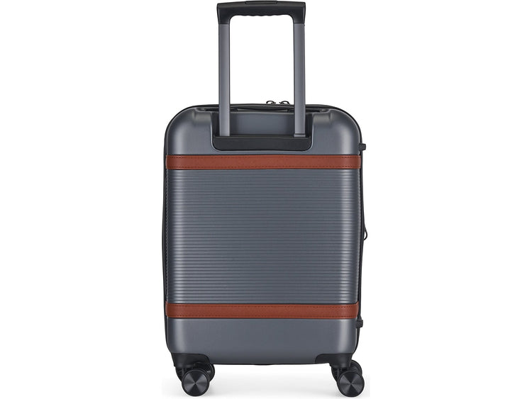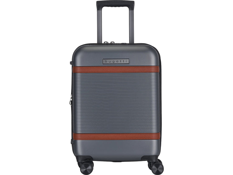 Discover the hardside luggage from the Bugatti Wellington collection. Made of lightweight ABS with vegan leather trims, this piece is built to last. The suitcase features a telescopic trolley handle that locks in two different positions and eight 360-degree spinner wheels for precise control and smooth, quiet rolling. Expandable and secure, this luggage features robust double zippers and a TSA combination lock. The inside includes a dividing panel, three tightening straps, and various pockets for optimized packing that remains in place during your trip. Perfect for all adventures.