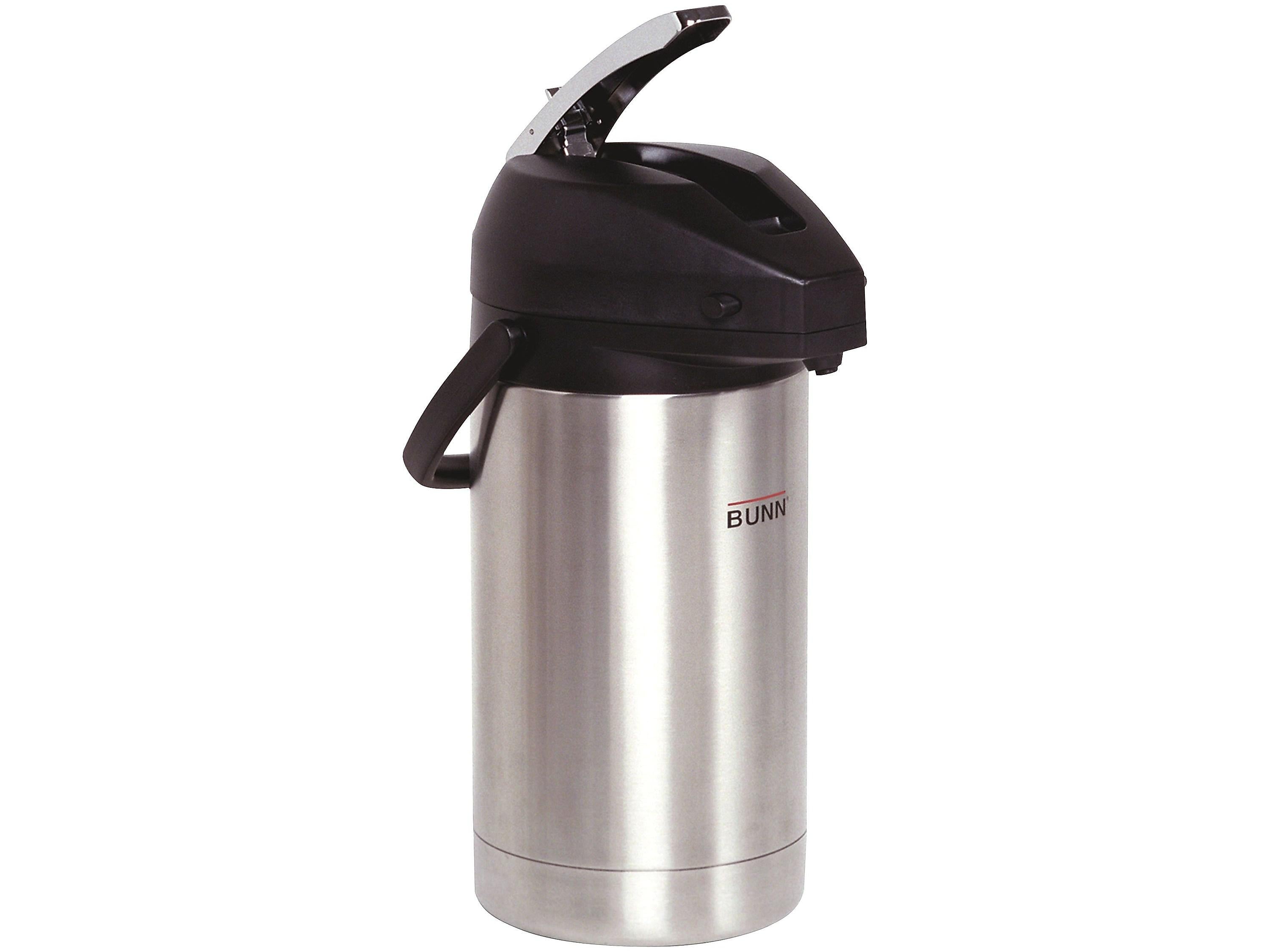 Give guests and staff access to fresh, delicious coffee with this Bunn 3-liter stainless steel lever-action airpot. A stainless steel lining keeps coffee hot for serving, and the push-lever dispenser makes it easy to pour a cup. This Bunn airpot comes with a convenient carrying handle, so you can transport it from the office kitchen or break room without touching the hot exterior.