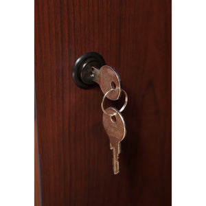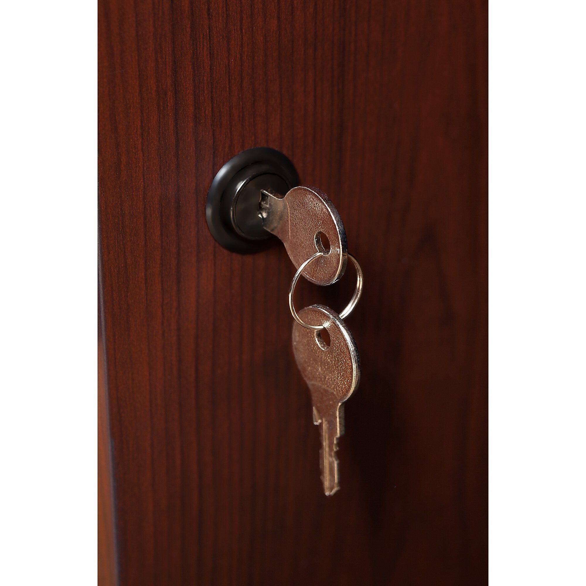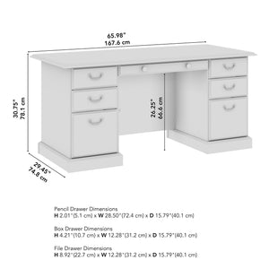 Update your workspace with the charm and elegance of the Bush Business Furniture Arlington Executive Desk with Drawers. Thoughtfully designed and built to last, this office desk has all of the storage and space you need to stay organized and comfortable. Its rich finish, Antique Brass accents, and decorative edge detailing provide a classic look you'll love for years. Solid construction with a durable work surface made of thermally fused laminate resists scratches and stains over time. Enjoy the convenient pencil drawer and two box drawers for office supplies, plus three file drawers that accommodate letter, legal, or A4-size files with full-extension ball bearing slides for easy reach to materials. The left pedestal includes a lock to protect sensitive files and valuable items. This computer desk meets ANSI/BIFMA standards for safety and performance and is backed by a 6 Year Warranty.