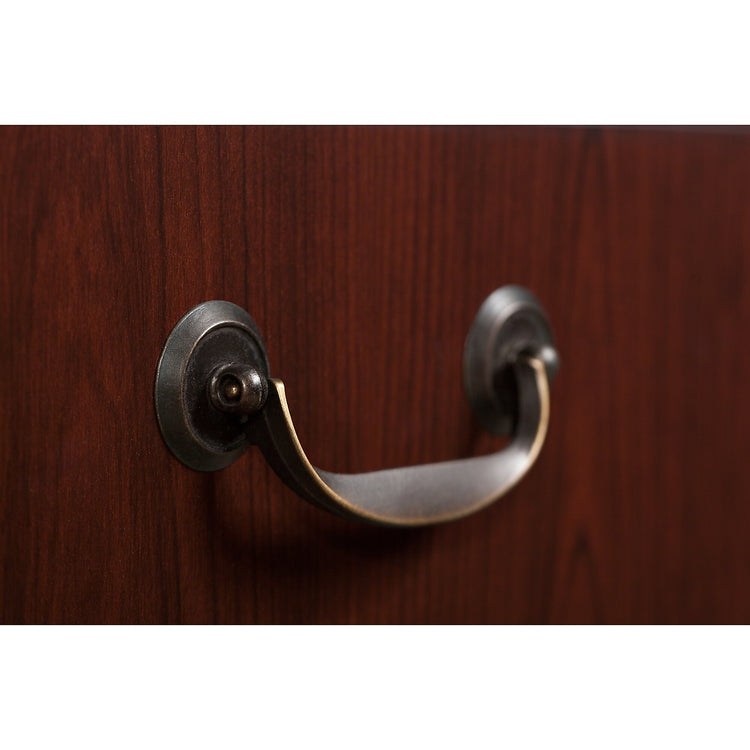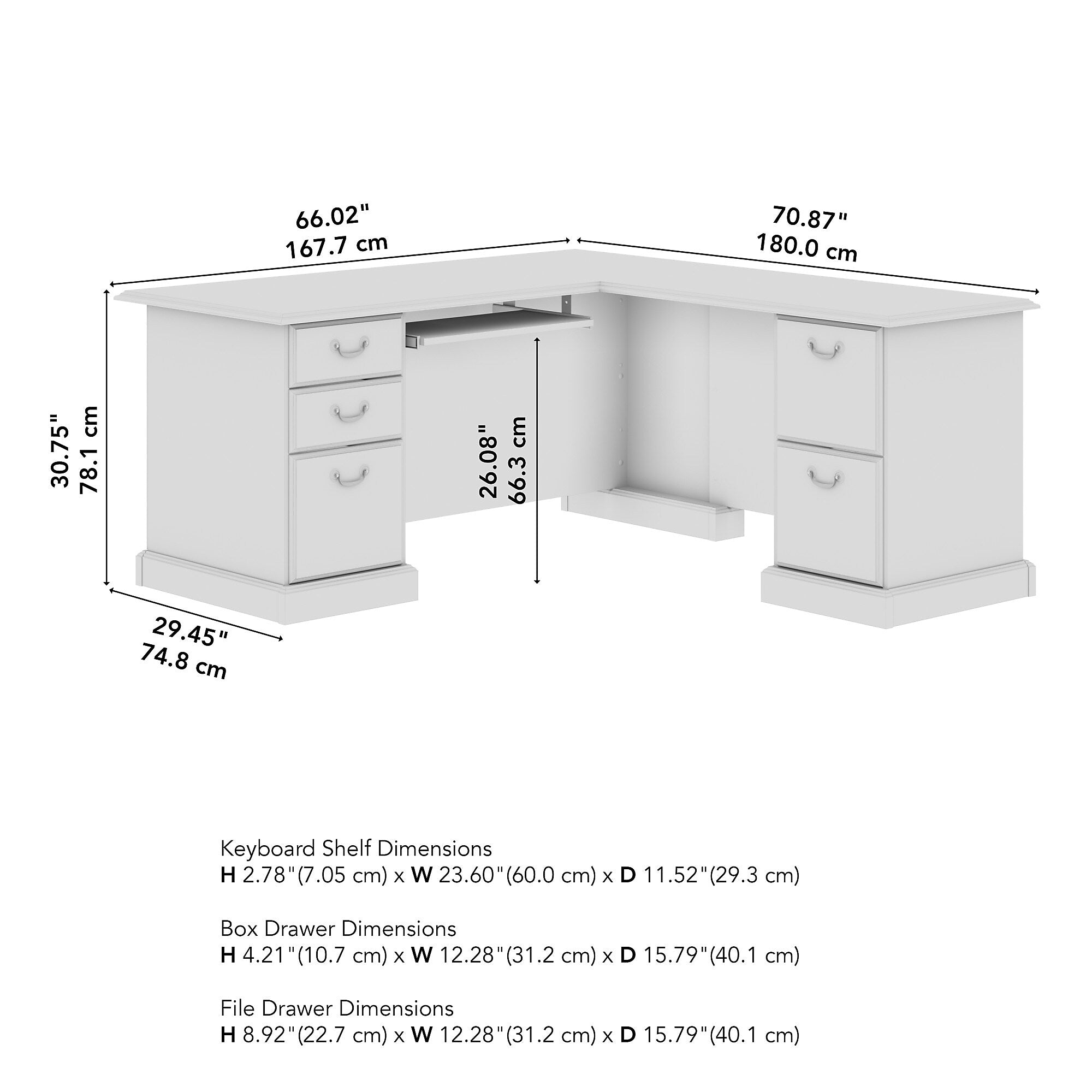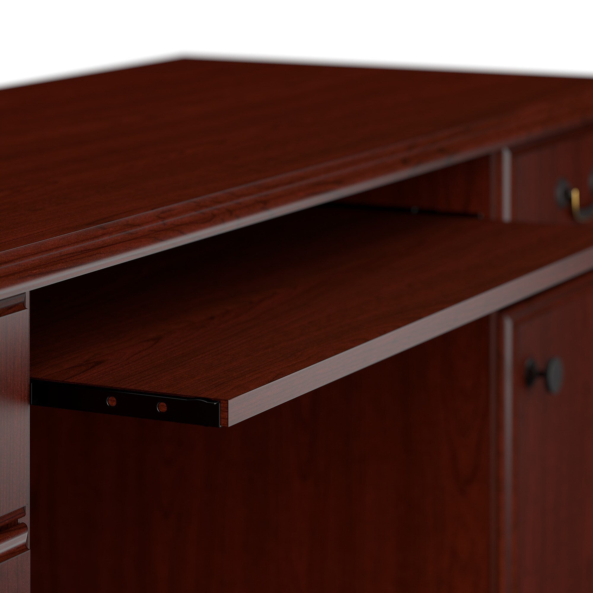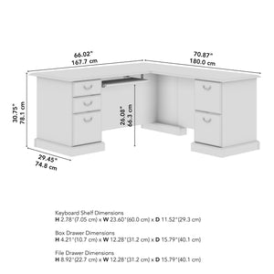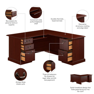 Outfit your home or workspace with the Bush Business Furniture Arlington L Shaped Desk with Drawers and Keyboard Tray. Its rich finish, Antique Brass accents, and decorative edge detailing provide a classic look with lasting charm that you will love for years to come. Spread out on a spacious L desk surface constructed of thermally fused laminate to resist scratches and stains over time. A pullout keyboard shelf frees up your desktop while two box drawers offer the perfect spot to store supplies. Three file drawers accommodate letter, legal, and A4-size files with full-extension ball bearing slides for an easy reach to materials. The L shaped computer desk is finished on all sides so you can place it in a corner or facing out into the room. This corner desk is built to last and tested to meet ANSI/BIFMA standards for safety, durability, and performance and is backed by a 6 Year Warranty.