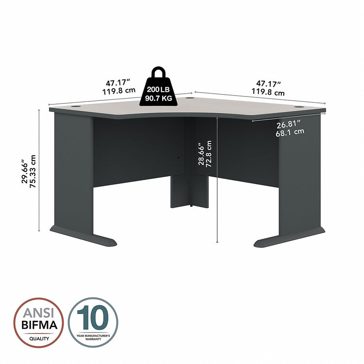 The Bush Business Furniture 48W Corner Desk maximizes your small office space with a convenient design and commercial-grade quality. Ideal for use in a corner, the Desk provides a comfortable curved work area, and a C-Leg design creates plenty of legroom. A scratch-resistant thermally fused laminate surface and thick end panels fend off damage, while sturdy feet with adjustable levelers ensure stability. Keep your cables in order with wire management grommets. The Corner Desk allows for easy configurations. Expand your work surface with coordinating Cubix Desks. Cubix offers a variety of layout options and multiple two-tone finishes. Backed by a 10 Year Warranty. American made with U.S. and imported parts.
