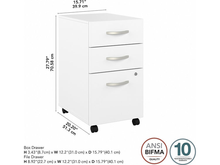 The Bush Business Furniture Hybrid three-drawer mobile file cabinet offers a stylish, long-lasting storage solution for the modern professional. Enjoy a neat and organized workspace with a file cabinet that conveniently rolls wherever you need access to important documents and supplies. The file drawer opens on smooth full-extension ball bearing slides for an effortless reach to letter-, legal-, and A4-size paperwork, while a pair of box drawers organize writing utensils, notepads, and more. The two bottom drawers can be secured by a single lock to protect sensitive files or personal items. The rolling file cabinet's compact design allows it to fit underneath a standard-size office desk for a space-saving configuration. Find the perfect look for your space with five contemporary finish options: black walnut, modern hickory, platinum gray, storm gray, and white. This three-drawer file cabinet with wheels has been meticulously tested to meet or exceed ANSI/BIFMA quality standards for safety, durability, and performance and is backed by the Bush Business Furniture 10-year manufacturer warranty. See the full Bush Business Furniture Hybrid collection for coordinating items to enhance your workspace as needed, including computer desks, bookcases, and storage cabinets (coordinating items sold separately). American-made with US and imported parts.
