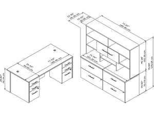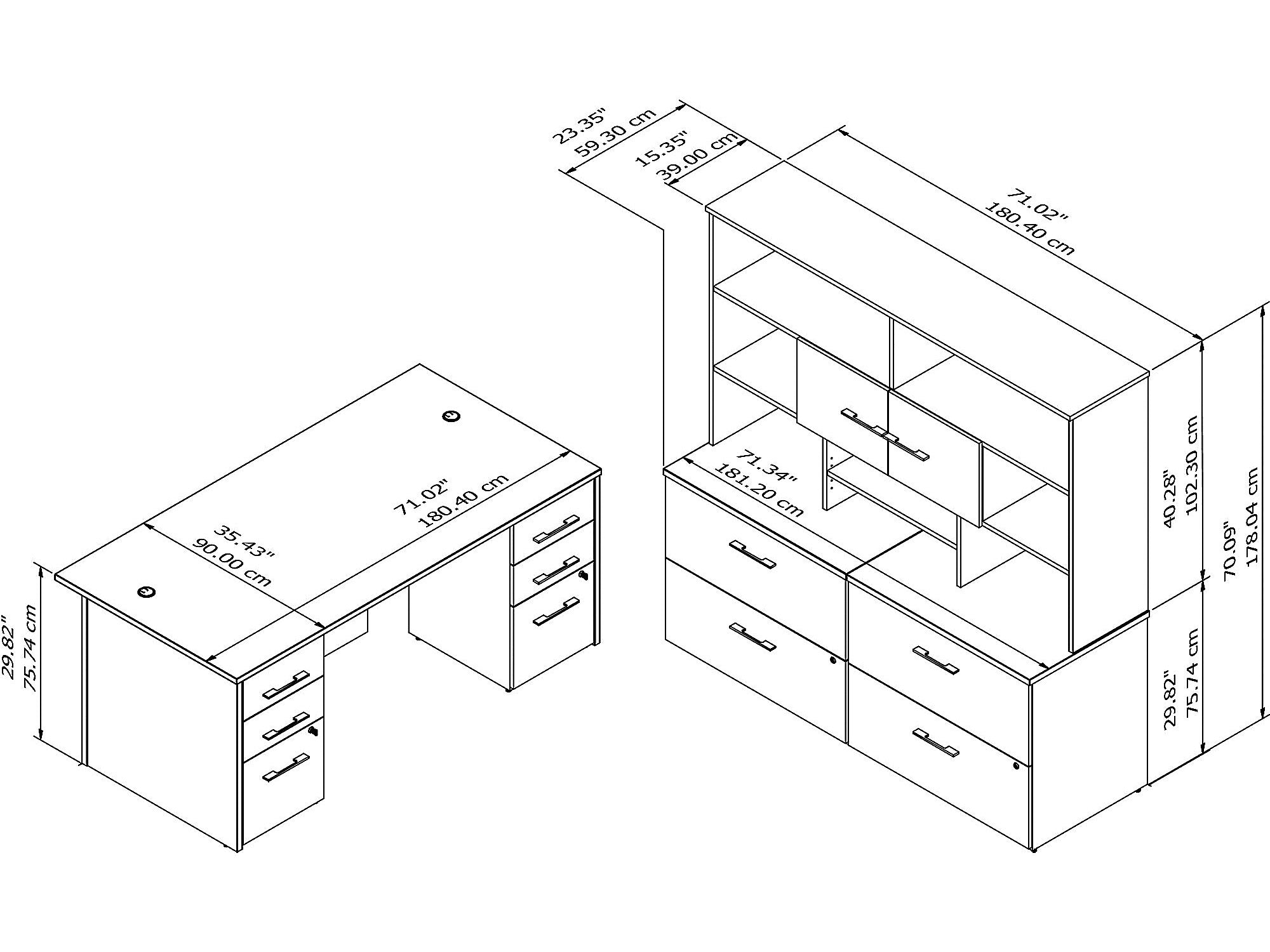 - Bundle includes: 71.02"W x 35.43"D executive desk, 71.02"W hutch, set of two 16"W three-drawer file cabinets, set of two 36"W two-drawer lateral file cabinets